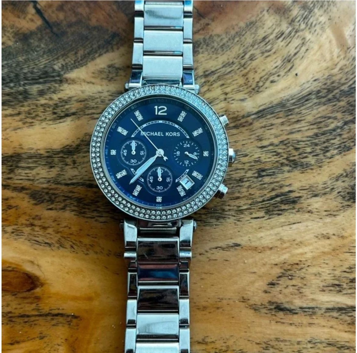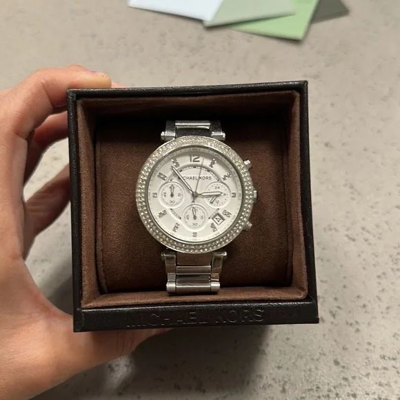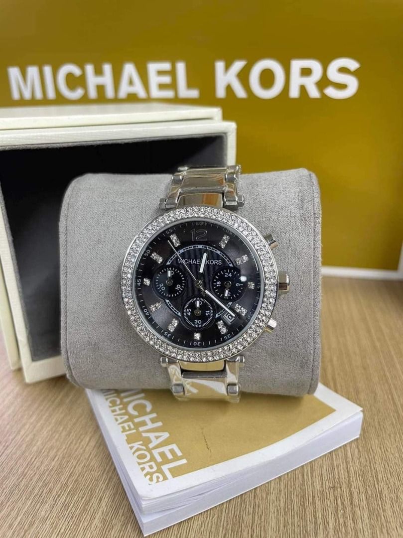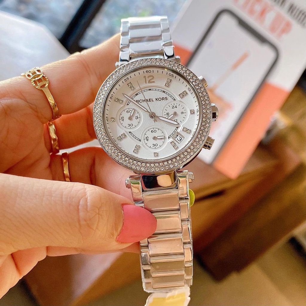 The Michael Kors Parker analog ladies’ watch is a celebrated timepiece that blends sophistication with functionality. Known for its refined design, it features a 39mm silver mother of pearl dial highlighted with white diamond studs on the ring, which adds an opulent touch. The chronograph functionality along with a date indicator ensures precise timekeeping, powered by original quartz machinery. The 12-hour format offers classic readability, while the 3-link silver chain guarantees style combined with durability. Water-resistant and from a 7AA premium collection, this model is ideal for those seeking timeless elegance and quality.