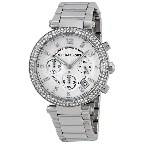 Experience elegance with the Michael Kors Parker ladies watch, featuring a 39mm silver mother of pearl dial embellished with white diamond studs. This chronograph watch offers precision with a 12-hour analog display, date indicator, and quartz movement. Water-resistant with a 3-link silver chain, this piece exudes luxury.